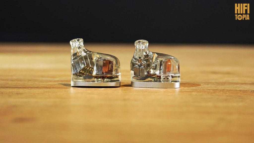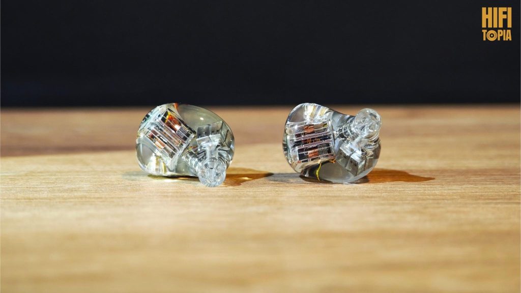 Shiny acrylic honeycomb patterned matte metal faceplate and transparent resin. It’s very nice to see everything, but actually it’s something we’re familiar with now. What’s really interesting is that the bass armatures are transparent. Yes, they’re transparent! They’re not covered with metal like other armatures. They’re covered with transparent plastic. You can see the coil. This is really cool. Other than that, the shells feel solid and sturdy. Despite having 10 drivers, they are not very big and fit well in the ear. The passive isolation is definitely above average.